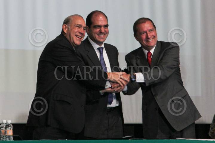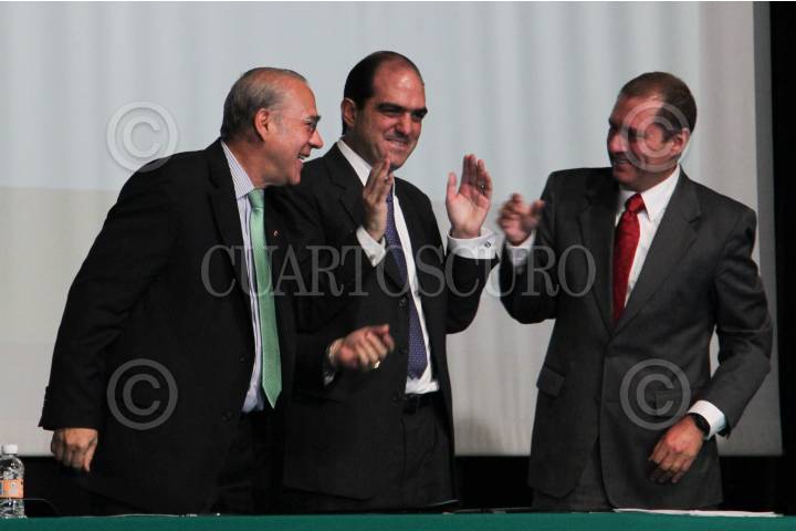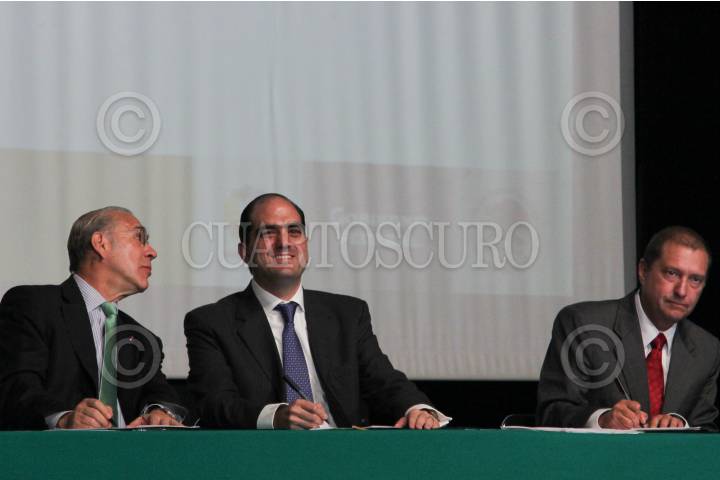 MÉXICO, D.F., 13ENERO2011.- José Ángel Gurría, secretario general de la Organización para la Cooperación y el Desarrollo Económicos, Daniel Karam Toumeh, director del Instituto Mexicano del Seguro Social y Eduardo Pérez Motta, presidente de la Comisión Federal de Competencia, durante la presentación de los "Lineamientos Desarrollados por la OCDE para combatir la colusión en Compras Pública" en el auditorio del IMSS. FOTO: MOISÉS PABLO/CUARTOSCURO.COM