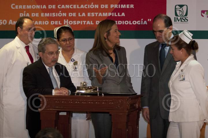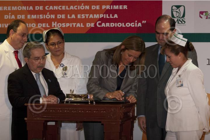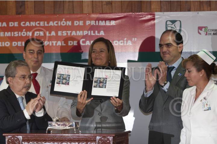 MÉXICO D.F., 13SEPTIEMBRE2011.- Margarita Zavala, Presidenta Nacional del DIF, y esposa del presidente de México, acompañada de, Daniel Karma Toumeh, director general del IMSS, Moisés Calderón, titular del Hospital de Cardiología y Pablo Reyes Pruneda, director del Servicio Postal Mexicano, encabezaron la ceremonia de cancelación de la estampilla postal con la que se conmemora el 50 aniversario del Hospital de Cardiología del Centro Médico Siglo XXI. FOTO: GUILLERMO PEREA/CUARTOSCURO.COM