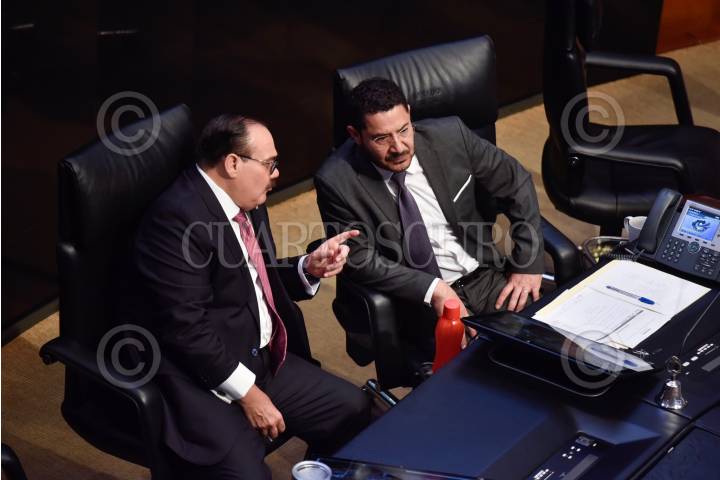CIUDAD DE MÉXICO, 14MAYO2019.- Se lleva a cabo la Sesión Extraordinaria de la LXIV Legislatura de la Cámara de Senadores, en donde se discute la aprobación de Ley de Equidad de género y la Ley Federal del Trabajo y de la Ley del seguro Social en materia de trabajadoras del hogar. En la imagen Jorge Carlos Ramírez Marín, vicepresidente de la mesa directiva y Martí Batres, presidente de la mesa directiva del senado. FOTO: MARIO JASSO /CUARTOSCURO.COM
