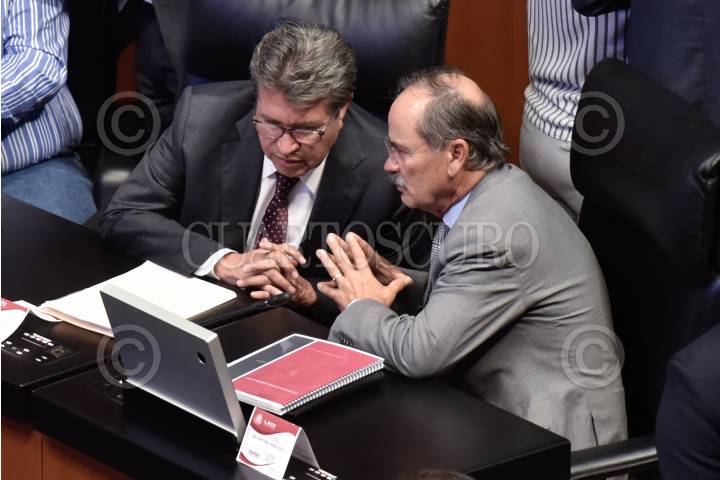 CIUDAD DE MÉXICO, 14MAYO2019.- Se lleva a cabo la Sesión Extraordinaria de la LXIV Legislatura de la Cámara de Senadores, en donde se discute la aprobación de Ley de Equidad de género y la Ley Federal del Trabajo y de la Ley del seguro Social en materia de trabajadoras del hogar. En la imagen, los senadores Ricardo Monreal (Morena) y Gustavo Enrique Madero (PAN). FOTO: MARIO JASSO /CUARTOSCURO.COM