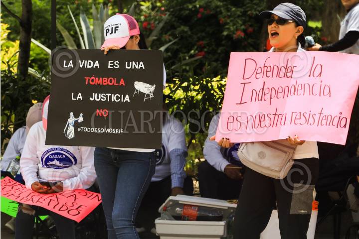 OAXACA, OAXACA, 23AGOSTO2024.- A cinco días de haber iniciado sus acciones de protesta y a 3 días de haber formalizado su paro de labores, trabajadores del Poder Judicial de la Federación en Oaxaca, permanecen al exterior de las sedes de la dependencia y con pancartas buscan comunicar el motivo de su protesta y el apoyo de la sociedad. FOTO: CAROLINA JIMÉNEZ/CUARTOSCURO.COM