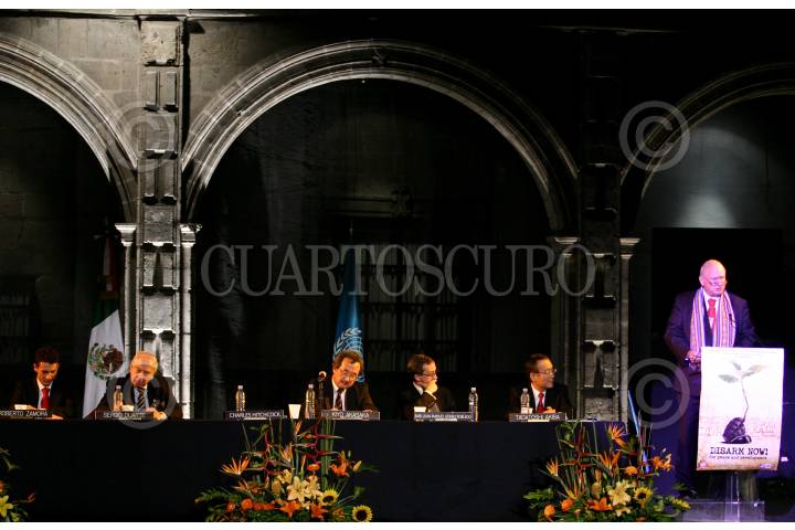 MÉXICO, D.F., 11SEPTIEMBRE2009.- Charles Hitchcock, presidente de la 62ª Conferencia Anual DIP/NGO; Kiyo Akasaka, subsecretario general adjunto del Departamento de Información Pública de la ONU; el embajador Juan Manuel Gomez; durante la ceremonia de clausura de la 62 Conferencia Anual de Información Pública de la ONU y las Organizaciones No Gubernamentales (DIP/ONG) “¡Desarme ahora! Trabajemos por la paz y el desarrollo” que se realizo en el ex Convento de San Hipolito. FOTO: RODOLFO ANGULO/CUARTOSCURO.COM