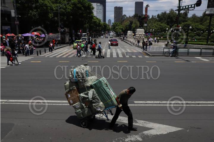 CIUDAD DE MÉXICO, 14JULIO2025.- Un diableros del Centro Histórico pasa por Eje Central cargando mercancía. FOTO: DANIEL AUGUSTO/ CUARTOSCURO.COM