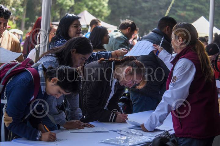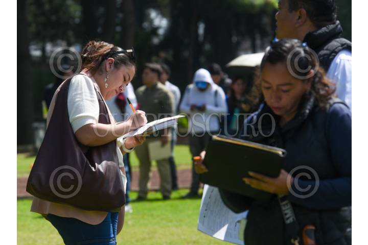 TOLUCA, ESTADO DE MÉXICO, 02SEPTIEMBRE2025.- Personas que acudieron a la Segunda Feria Regional del Empleo que tuvo como sede el Parque Metropolitano de Toluca, llenan formatos de empleo previo a su ingreso a los módulos en donde se ofrecieron más de 2 mil vacantes ofertadas por 135 empresas del Valle de Toluca. FOTO: CRISANTA ESPINOSA AGUILAR/CUARTOSCURO.COM