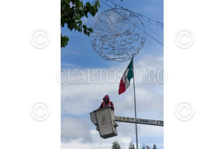 TOLUCA, ESTADO DE MÉXICO, 03SEPTIEMBRE2025.- Un trabajador del municipio de Toluca instala adornos patrios en el centro de la capital mexiquense, apoyado por una grúa para colocarlos en zonas elevadas y hacerlos visibles para los visitantes. FOTO: CRISANTA ESPINOSA AGUILAR / CUARTOSCURO.COM