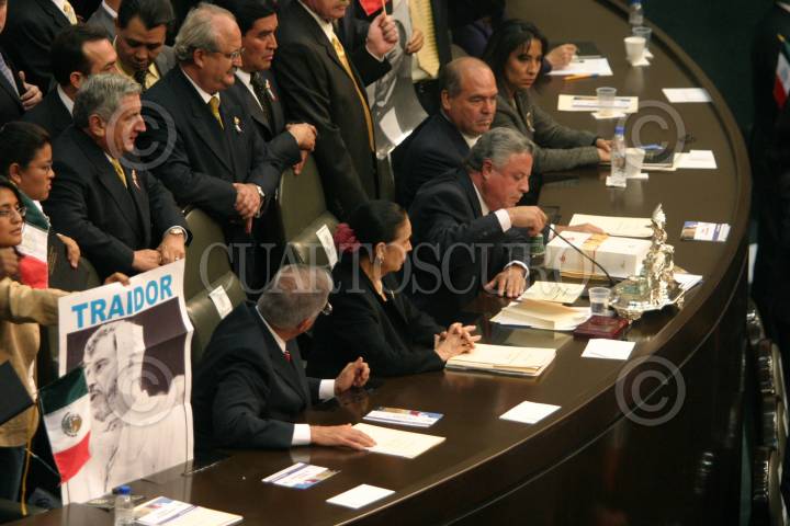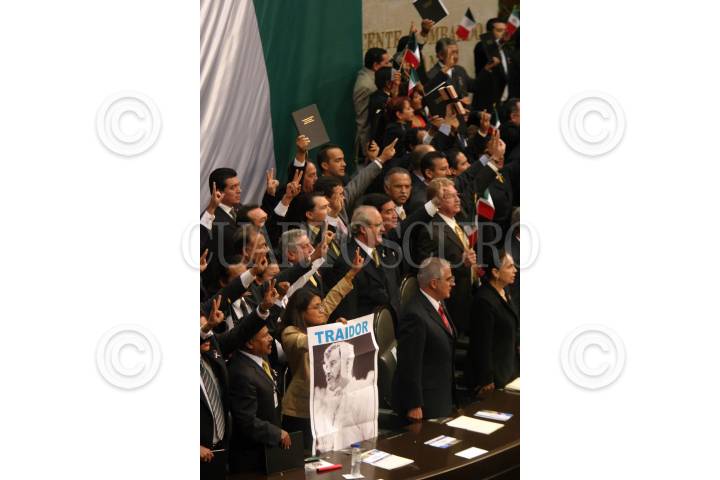 MEXICO, D.F., 01SEPTIEMBRE2006.- Legisladores del PRD cantaron el himno nacional al finalizar la sesiòn por el presidente de la Cámara de Diputados, al no haber condiciones para seguir con la ceremonia en la que supuestamente el presidente Vicente Fox rindiera su informe de gobierno. Los perredistas mostraron mantas alusivas a el presidente que lo califican como un traidor. FOTO: Moisés Pablo/CUARTOSCURO.COM