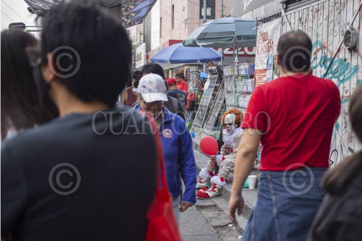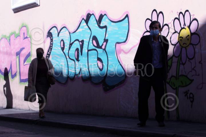 Escena cotidiana en el centro de Cuernavaca, transeúntes caminan frente a unos grafitis en la calle Degollado.