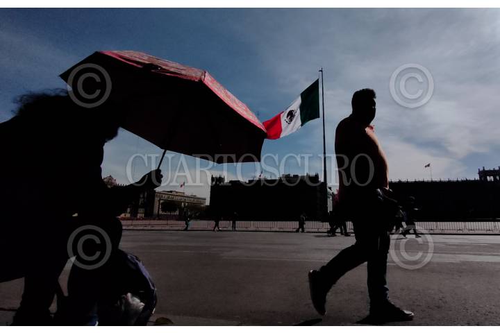 CIUDAD DE MÉXICO, 11ENERO2024.- Una persona se cubre del sol utilizando una sombrilla mientras cientos de personas caminan por el Zócalo de la capital. FOTO: DANIEL AUGUSTO/ CUARTOSCURO.COM