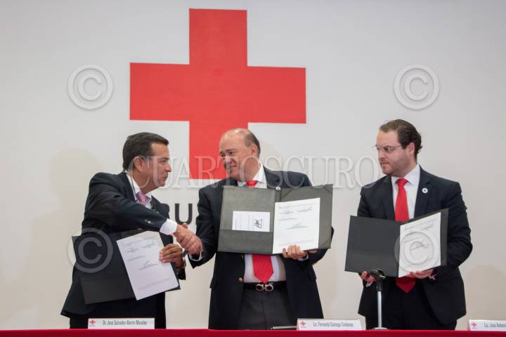 CIUDAD DE MÉXICO, 23SEPTIEMBRE2019.- José Salvador Aburto, Director General del Centro Nacional de Trasplantes; Fernando Suinaga, Presidente del Consejo Nacional de Directores de Cruz Roja Mexicana y Antonio Zermeño, Director General de la Cruz Roja, encabezaron la firma del convenio entre la Cruz Roja y el Centro Nacional de Transplantes. FOTO: ROGELIO MORALES /CUARTOSCURO.COM
