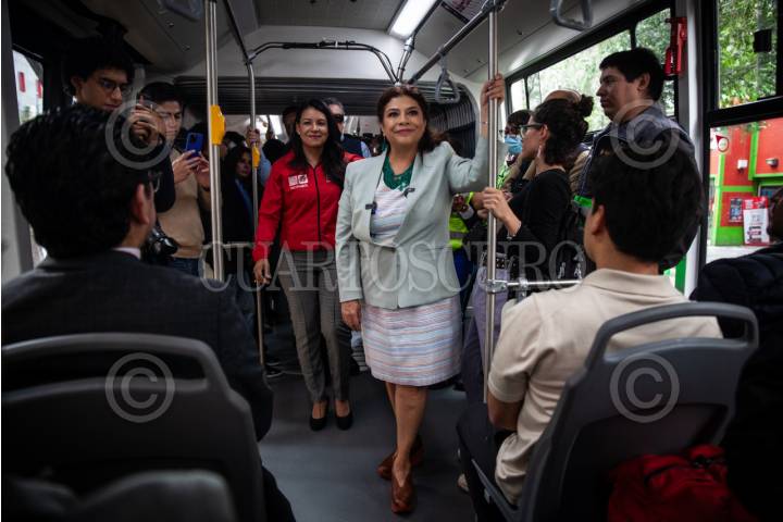 CIUDAD DE MÉXICO, 06MARZO2025.- Clara Brugada, jefa de gobierno de la Ciudad, encabezó la entrega de 3 unidades eléctricas de camiones para metrobús, esta vez para la línea roja y se llevó a cabo en la glorieta de los insurgentes. FOTO: ANDREA MURCIA /CUARTOSCURO.COM