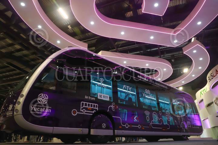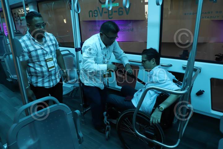 MÉRIDA, YUCATÁN, 09JULIO2024.- En el marco de la quinta edición del Smart City Expo LATAM Congress 2024 se presentó una unidad de transporte público del sistema Va-y-Ven que dará servicio en Mérida, el cual se caracteriza por ser de fácil accesibilidad para personas con discapacidades físicas. Luis Quintana, originario de Cuernavaca, accedió a hacer una demostración para que confirmar que las unidades son amigables para las personas que se movilizan en silla de ruedas, ahí confirmó que este transporte, que también es totalmente eléctrico, cuenta con rampas y cinturones de seguridad para que los traslados sean seguros. FOTO: MARTIN ZETINA/CUARTOSCURO.COM