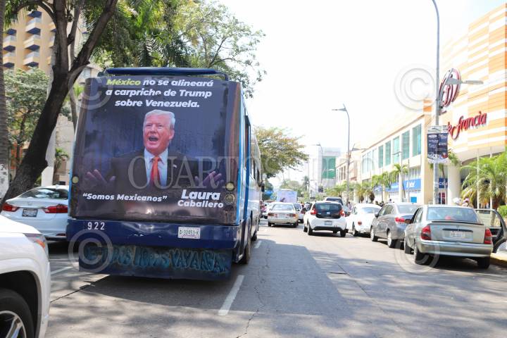 ACAPULCO, GUERRERO, 18FEBRERO2019.- Camiones del trasporte urbano circulan con propaganda con la imagen de Donal Trump, presidente de Estados Unidos, y la posición de México ante la situación de Venezuela. FOTO: BERNANDINO HERNÁNDEZ /CUARTOSCURO.COM