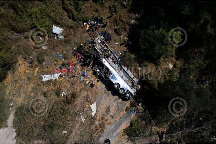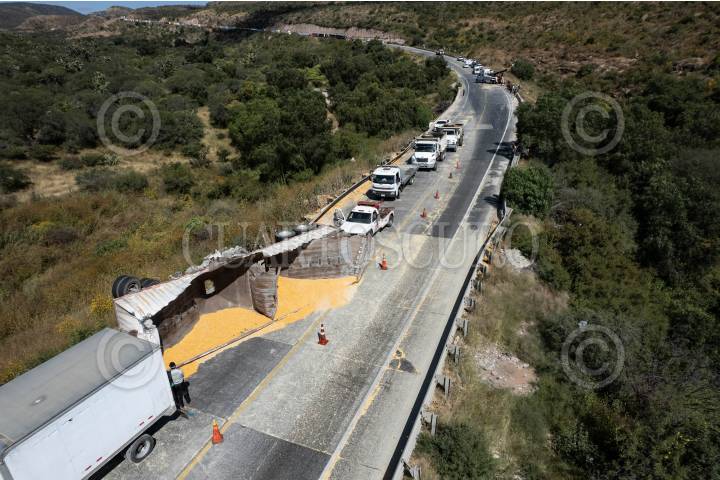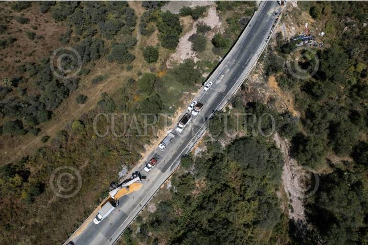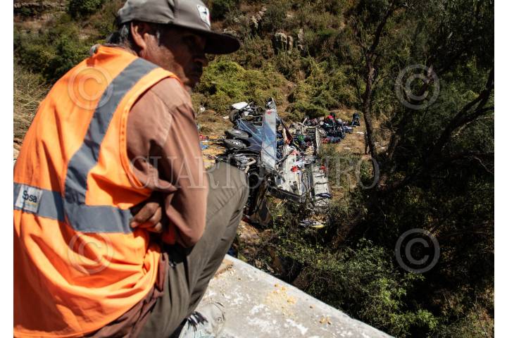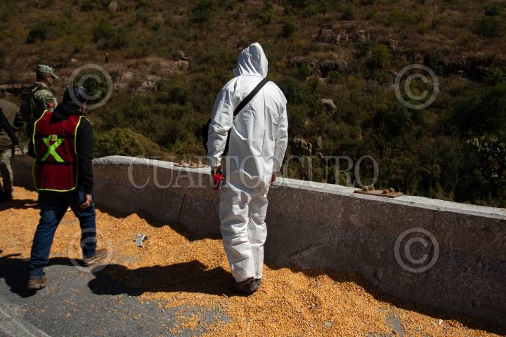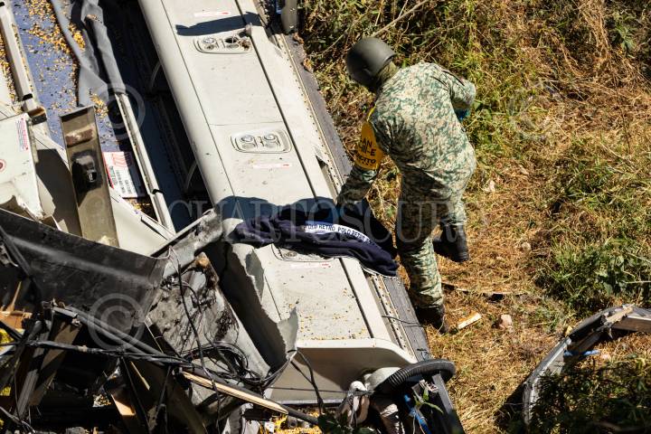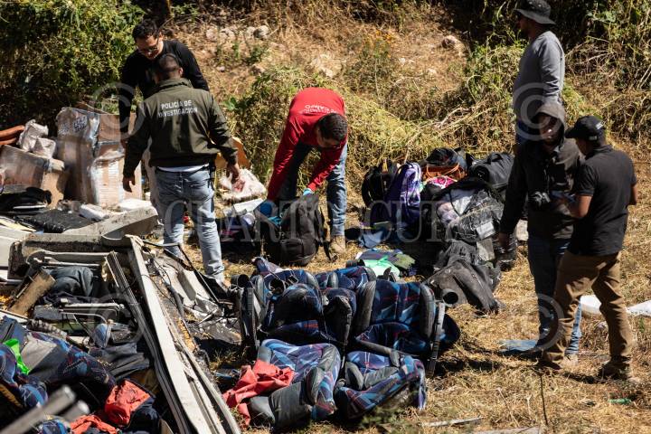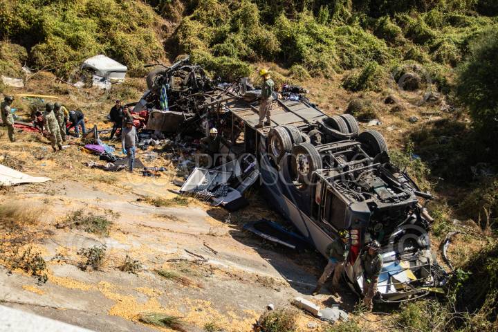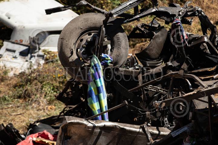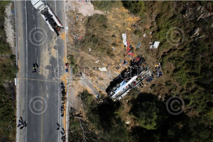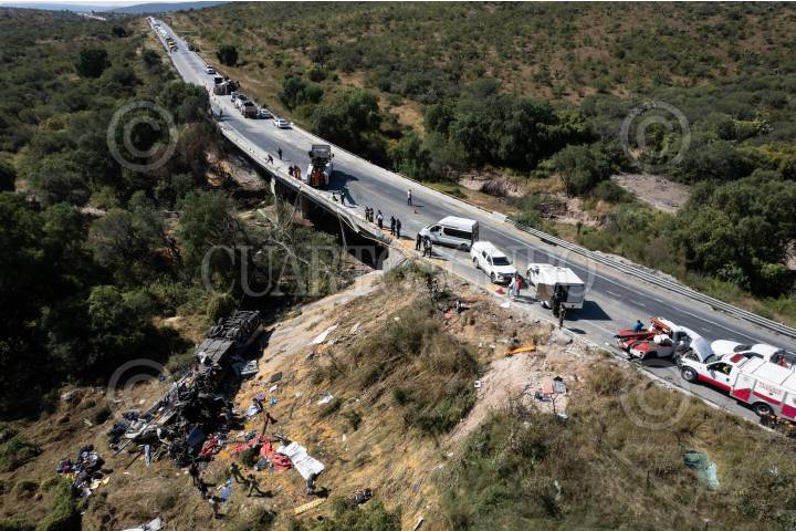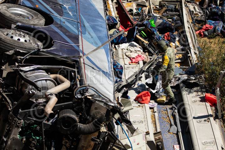 CUAUHTEMOC, ZACATECAS, 26OCTUBRE2024.- Un accidente carretero entre un autobús y un tráiler, sobre la autopista No. 45 Aguascalientes-Zacatecas, cobró la vida de 19 personas y seis más entidad de gravedad. El percance se presentó alrededor de las 3 horas de la madrugada cuando un camión de la empresa Ómnibus de México que había salido de Nayarit y con destino a Ciudad Juárez, chocó con uno de los remolques de un tráiler que transportaba maíz, lo que provocó que tras el impacto cayera sobre un arrollo. Equipos de recate de todos los niveles se dieron cita para auxiliar lesionados quienes fueron trasladados a hospitales en la ciudad de Zacatecas. Hasta las 12 horas fue rescatado el último cuerpo que yacía bajo el camión. El accidente provocó el alto total a l circulación, por lo que grandes filas se mantienen sobre la carretera. FOTO: ADOLFO VLADIMIR /CUARTOSCURO.COM