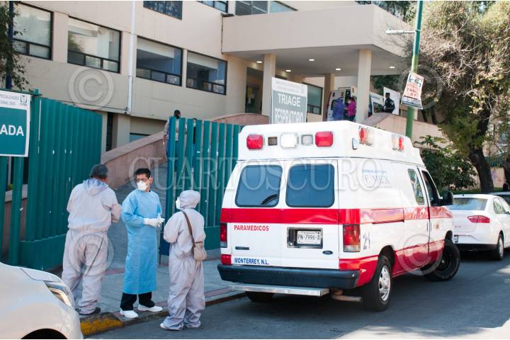 Paramédicos hablan con personal del Triage del Centro Médico Siglo XXI para verificar que pueden dejar hospitalizado a un enfermo por Covid-19 que trasladan en la ambulancia.