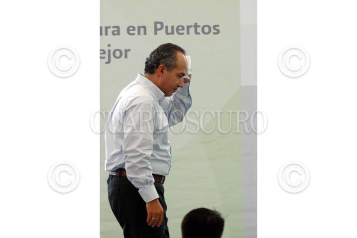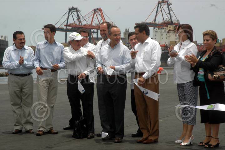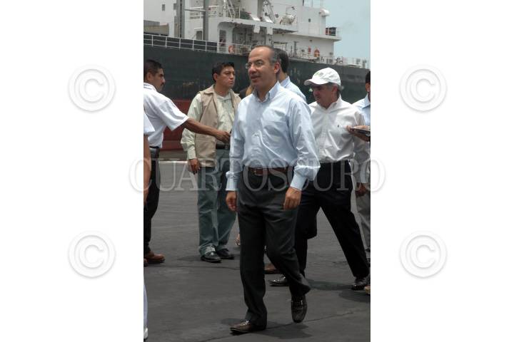 VERACRUZ, VERACRUZ. 07AGOSTO2008.- El presidente, Felipe Calderón Hinojosa, durante su gira de trabajo por el estado de Veracruz, inauguro el muelle cinco dentro del recinto portuario así como el tramo carretero denominado "kilómetro trece y medio", que sirve de acceso directo a los camiones de carga pesada hacia la zona portuaria. FOTO: JOSÉ CANDELARIO /CUARTOSCURO.COM