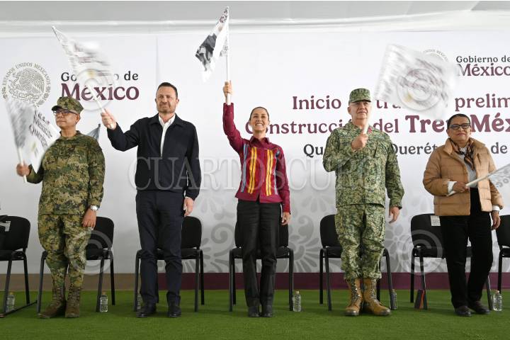 SANTIAGO DE QUERÉTARO, QUERÉTARO, 13OCTUBRE2024.- Raymundo Pedro Morales Ángeles, secretario de Marina; Mauricio Kuri González, gobernador de Querétaro; Claudia Sheinbaum, Presidenta de México; Ricardo Trevilla Trejo, Secretario de la Defensa Nacional; y Rosa Icela Rodríguez, secretaria de Gobernación, dieron el banderazo de inicio de obras de la construcción del Tren México-Querétaro. FOTO: PRESIDENCIA DE LA REPÚBLICA/CUARTOSCURO.COM
