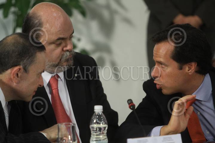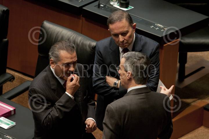 MÉXICO, D.F., 13OCTUBRE2011.- El senador perredista Graco Ramírez, PRD, conversando con los senadores priistas Fernando Castro Trenti, y Manlio Fabio Beltrones, coordinador, durante la discusión en lo particular de la iniciativa de ley reglamentaria del juicio de amparo. FOTO: MOISÉS PABLO/CUARTOSCURO.COM