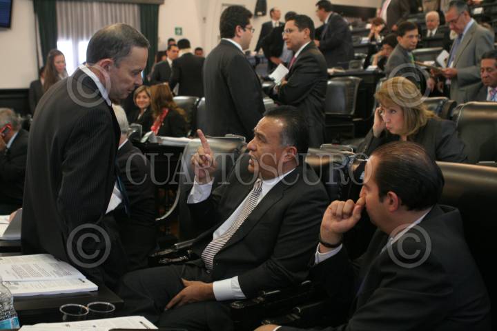 MÉXICO, D.F., 14ABRIL2011.- Los senadores Carlos Navarrete, coordinador perredista, Manlio Fabio Beltrones, presidente del Senado, José González Morfín, coordinador panista y Fernando Castro Trenti, priista, en la sesión en su segundo día de actividades de la nueva sede de la Cámara Alta. FOTO: CUARTOSCURO.COM
