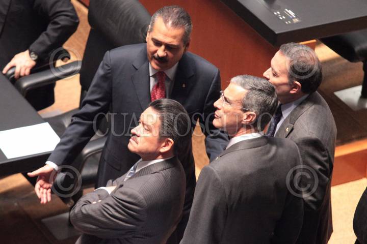 MÉXICO, D.F., 01FEBRERO2011.- Los senadores Fernando Castro Trenti, Juan Bueno Torio, Ruben Camarillo Ortega, Manlio Fabio Beltrones y Javier Castelo Parada, antes del inicio de la primera sesión ordinario en el Senado de la República. FOTO: MOISÉS PABLO/CUARTOSCURO.COM