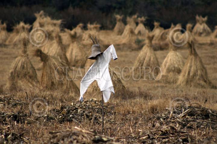 Un espantapájaros colocado en un sembradío de avena.