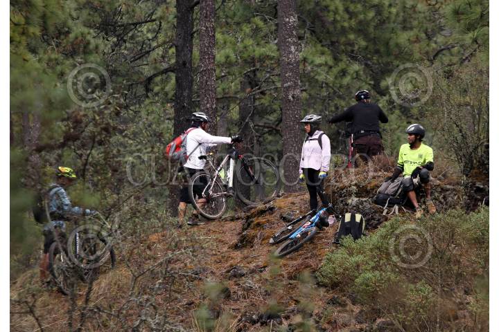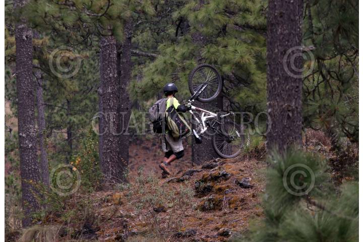 Algunos ciclistas recorren el paraje conocido como el Llano de los Conejos, en el bosque de este municipio ubicado al norte de la entidad, en la frontera con la Ciudad de México.