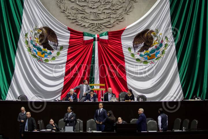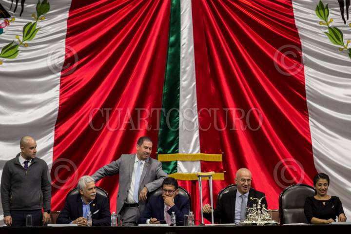 Dante Delgado, dirigente nacional de Movimiento Ciudadano, y legisladores del mismo grupo parlamentario, toman la tribuna previo a la instalación de Comisión Permanente del Congreso de la Unión.