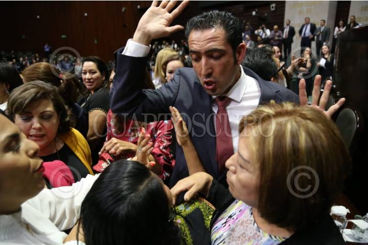 CIUDAD DE MÉXICO, 19FEBRERO2019.- El diputado Miguel Alonso Riggs participo en la toma de la tribuna cuando se encontraban en la discusión de regormas al artículo 19 en materia de prisión preventiva, la secretaría Karla Almazán señalo que sus compañeros panistas le arrebataron el microfono de forma violenta. FOTO: CUARTOSCURO.COM