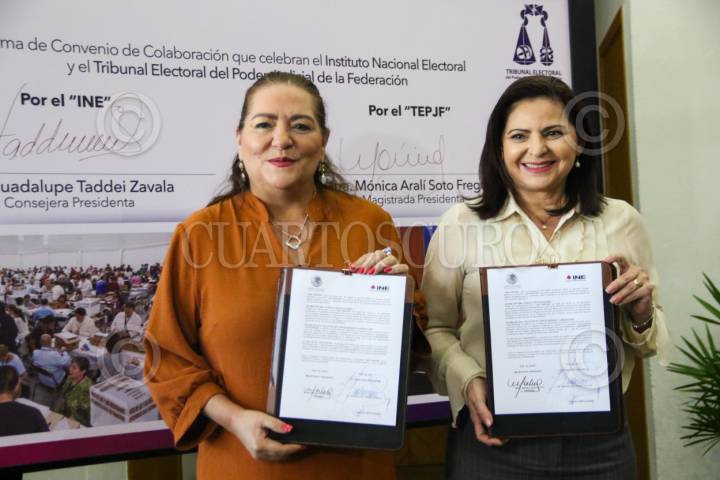 CIUDAD DE MÉXICO. 11MARZO2024.- Guadalupe Taddei del INE y Mónica Areli Soto magistrada del TSJF, firmaron un convenio de colaboración este estos dos órganos encargados de la realización vigilancia de las elecciones del 2 de junio en nuestro país. FOTO: VICTORIA VALTIERRA/CUARTOSCURO.COM