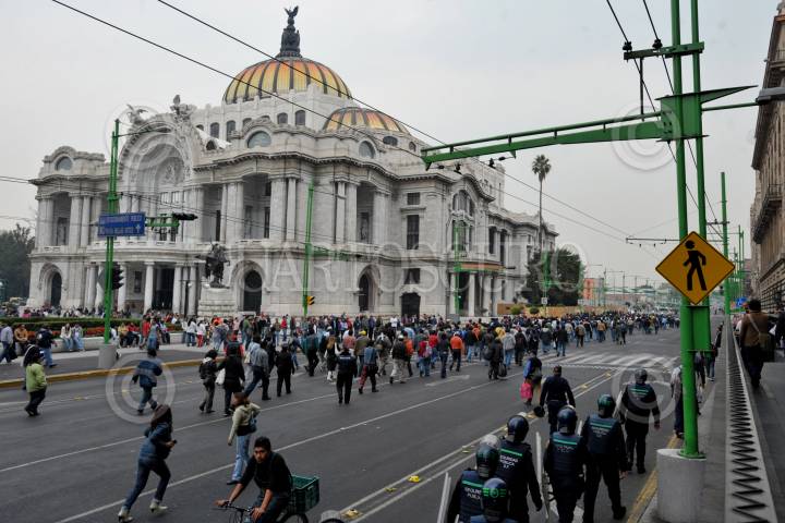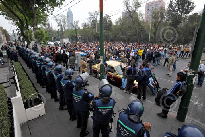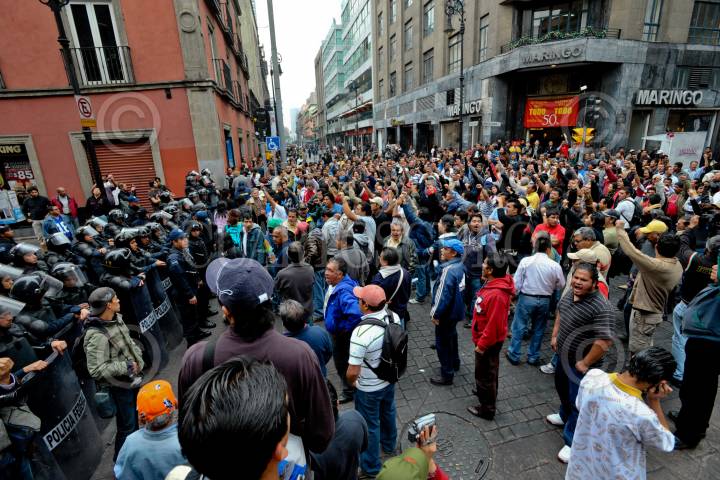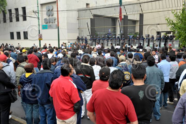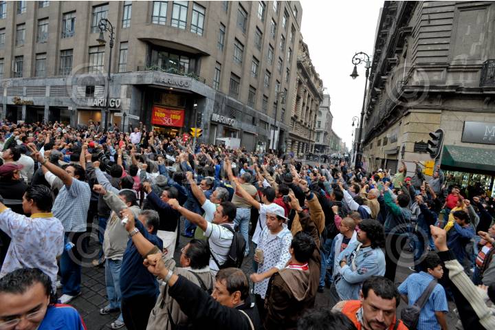 MÉXICO, D.F., 07ENERO2010.- Integrantes del Sindicato Mexicano de Electricistas (SME) se manifestaron en las calles Bolívar y Francisco I. Madero donde personal de Comisión Federal de Electricidad (CFE). Realizaban trabajos de mantenimiento en el cableado subterráneo. Dicho lugar fue resguardado por elementos de la Policía Federal. Retirándose en marcha por distintas dependencias como Sistema de Administración Tributaria (SAT). En avenida Hidalgo y el Senado de la República en la Torre Caballito en Reforma y Bucareli. FOTO: LUIS CARBAYO/CUARTOSCURO.COM