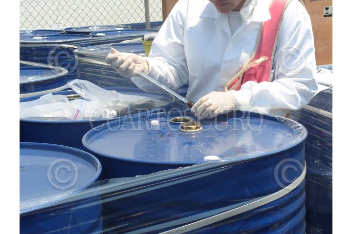 NANZANILLO, COLIMA 06MAYO2010.-En coordinación entre el Servicio de Administración Tributaria, la Secretaría de Marina-Armada de México y la Procuraduría General de la República, se llevó a cabo el aseguramiento de un cargamento de alrededor de 80 mil kilogramos de Ethyl Phenyl Acetate (Fenil Acetato de Etilo), mismos que eran transportados en los contenedores números GLDU3375059, TTNU3743918, IPXU3007138, GLDU3471685 y TTNU1875622, a bordo del buque “MSC NORASIA ALYA”, procedentes de Shangai, China, y que fueron descargados en mencionado puerto mexicano. El citado precursor puede ser utilizado ilícitamente para la elaboración de drogas sintéticas (crack, cristal, éxtasis, etcétera) y como acetato etílico, modificando su estructura (adicionando o eliminando reactivos) para la conversión de la cocaína básica en clorhidrato de cocaína, utilizándolo como solvente en la fase final de proceso. FOTO: CUARTOSCURO.COM