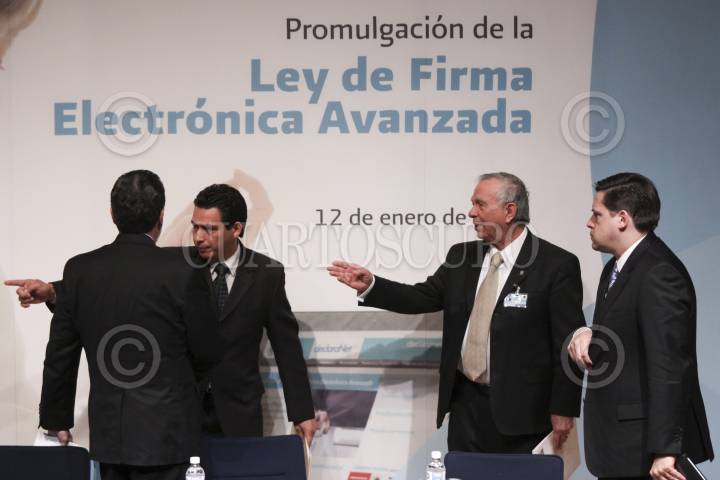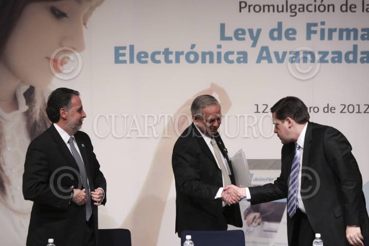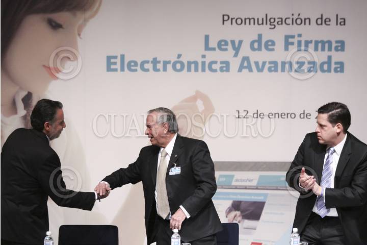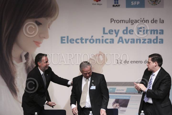 MÉXICO, D.F., 12ENERO2012.- Bruno Ferrari, Secretario de Economía; Rafael Morgan Ríos, Secretario de la Función Pública; y Alfredo Gutiérrez Ortiz Mena, jefe del Sistema de Administración Tributaria (SAT) promulgaron la Ley de Firma Electrónica Avanzada. FOTO: IVÁN STEPHENS/CUARTOSCURO.COM