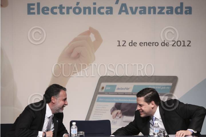 MÉXICO, D.F., 12ENERO2012.- Bruno Ferrari, Secretario de Economía; y Alfredo Gutiérrez Ortiz Mena, jefe del Sistema de Administración Tributaria (SAT) promulgaron la Ley de Firma Electrónica Avanzada. FOTO: IVÁN STEPHENS/CUARTOSCURO.COM