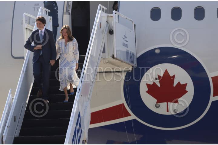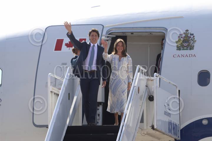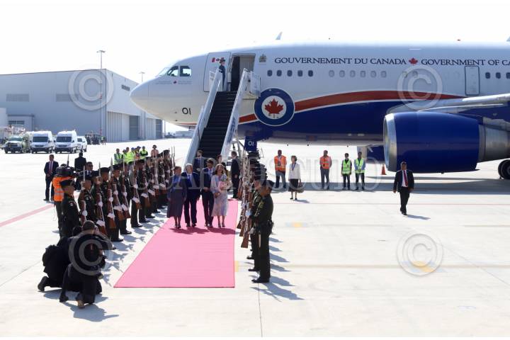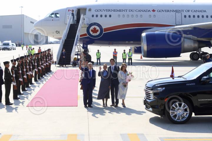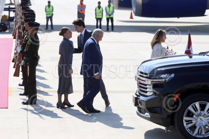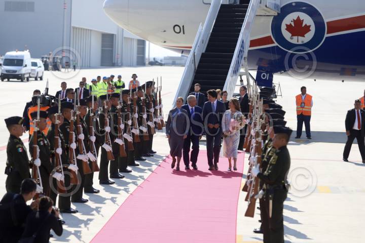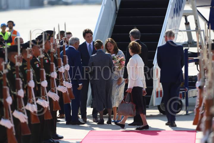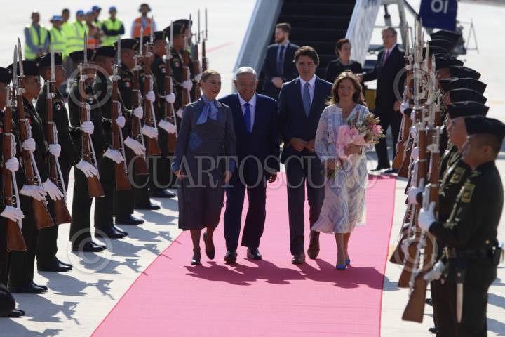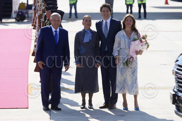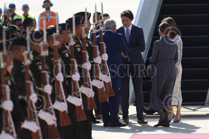 El presidente de la República Andrés Manuel López Obrador y su esposa Beatriz Gutiérrez Müller reciben al primer ministro de Canadá, Justin Trudeau y su esposa Sophie Grégoire en el Aeropuerto Internacional Felipe Ángeles. La visita del mandatario norteamericano a nuestro país comprende la X Cumbre de Líderes de América del Norte.