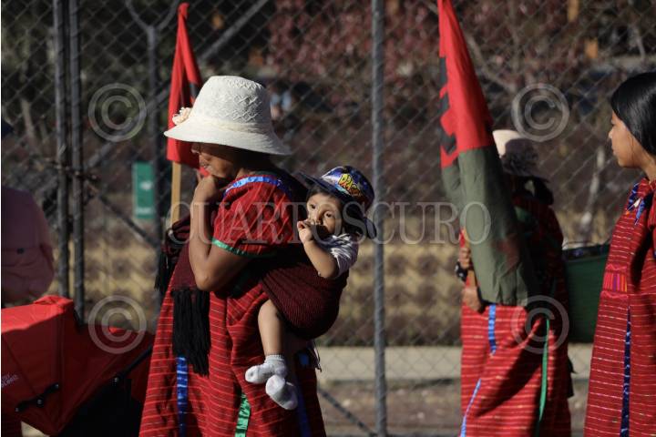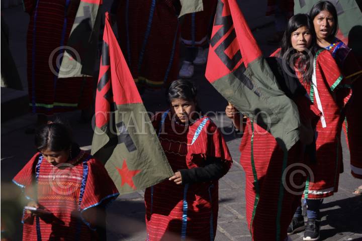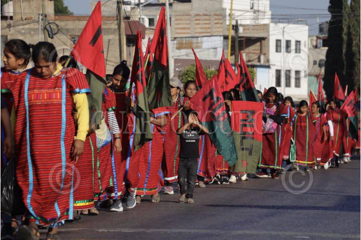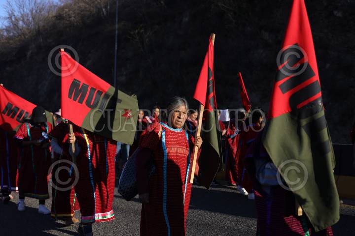 OAXACA DE JUÁREZ, OAXACA, 02FEBRERO2024.- Cientos de militantes del Movimiento de Unificación y Lucha Triqui (MULT) marcharon en la capital de Oaxaca para conmemorar 43 años de lucha, ademas de exigir paz en la zona triqui y justicia para sus compañeros asesinados, que durante el primer año del sexenio del gobernador morenista Salomón Jara, suman 12 personas. FOTO: CAROLINA JIMÉNEZ/CUARTOSCURO.COM