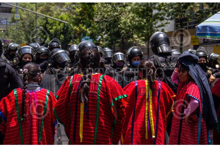Indigenas comerciantes se formaron en filas frente a los policías que impedian su traslado al Centro Histórico