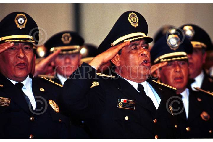Policias de diferentes corporaciones y delegaciones recibieron hoy ascensos por parte de la Secretaria de Seguridad Pública capitalina. El evento fue presidido por Marcelo Ebrard, quien pidió a los legisladores mejores armas jurídica para poner a los delincuentes reincidentes en su lugar, y no "dejarlos libres luego de dar unos cuantos pesos". FOTO: Juan Pablo Zamora/CUARTOSCURO.COM