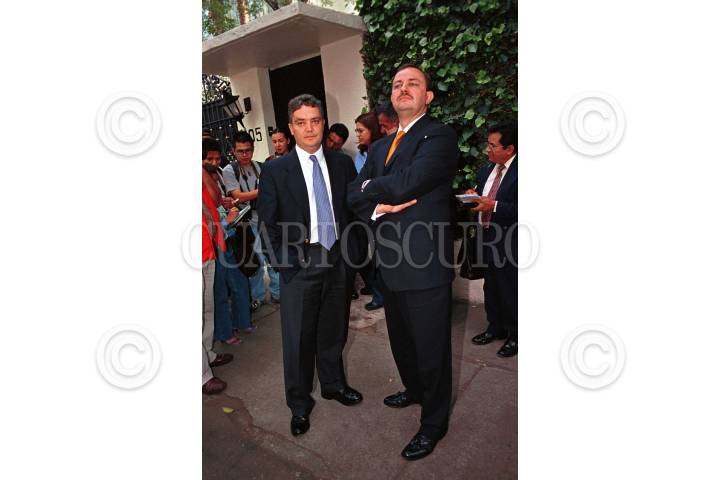 Francisco Xavier Borrego y Tristan Canales, representantes jurídicos de TVAzteca, acompañados de un notario público acudieron a las oficinas de Javier Moreno Valle, propietario de Canal 40, para entragar una solicitud para que Moreno Valle informe a TV Azteca el estado de deuda en el que se encuentra actualmente Canal 40. FOTO: Juan Pablo Zamora/CUARTOSCURO.COM