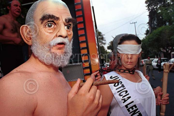 En alusión al bufete de abogados de Diego Fernández de Cevallos, quienes defendieran a CNI en la disputa por las instalaciones del cerro del Chiquihuite, Personal de TVAzteca realizó una sátira frente a las oficinas de Javier Moreno Valle, propietario de CNI. FOTO: Juan Pablo Zamora/CUARTOSCURO.COM