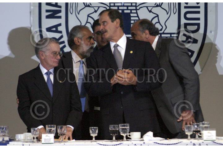 MEXICO, D. F. 19AGOSTO2005.- Manuel Tron Campos, presidente de la Cámara Nacional de Comercio, Servicios y Turismo de la ciudad de México, conversa con el presidente Vicente Fox en la comida con miembros de dicha cámara con motivo de su CXXXI aniversario. FOTO: Nelly Salas/CUARTOSCURO.COM