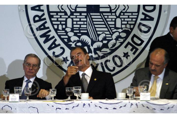 MEXICO, D. F. 19AGOSTO2005.- Manuel Tron Campos, presidente de la Cámara Nacional de Comercio, Servicios y Turismo de la ciudad de México y el presidente Vicente Fox durante la comida con miembros de dicha cámara con motivo de su CXXXI aniversario. FOTO: Nelly Salas/CUARTOSCURO.COM