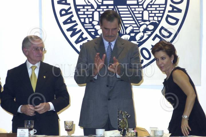 MEXDF27AGO2004.- Manuel Tron Campos, presidente del Consejo Directivo de la Cámara Nacional de Comercio, el presidente Vicente Fox Quesada junto con su esposa Marta Sahagún de Fox en la comida con motivo del CXXX aniversario de la Cámara Nacional de Comercio, Servicios y Turismo de la ciudad de México. FOTO: Eunice Adorno/CUARTOSCURO.COM