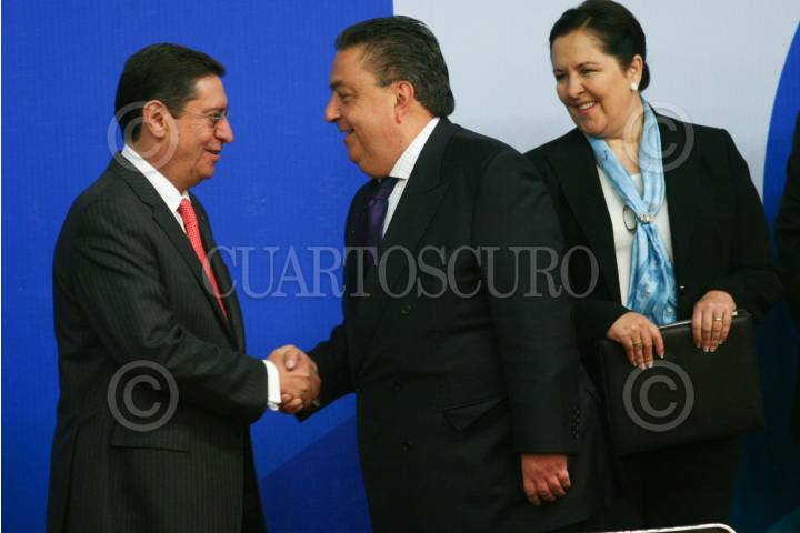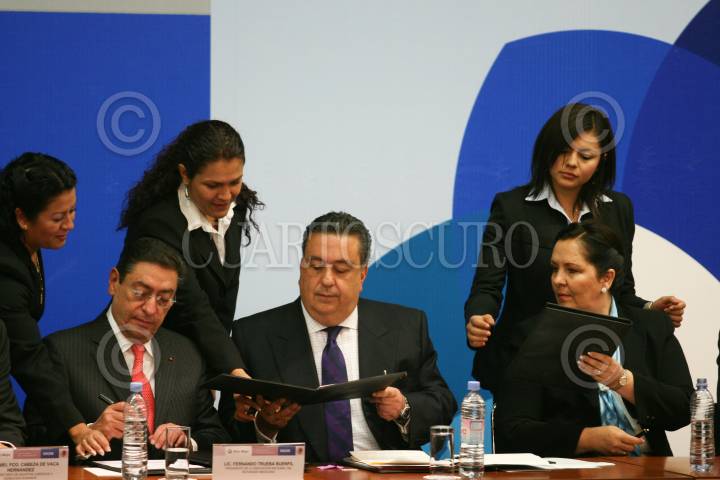 MÉXICO, D.F., 05DICIEMBRE2008.- Fernado Trueba Buenfil, Presidente de la Asociación Nacional del Notariado Mexicano, Fernando Gómez Mont, Secretario de Gobernación y Ana Teresa Aranda Orozco, Subsecretaría de Población e Identificación Personal, presidieron la firma del convenio de acciones entre la SEGOB y Asociación Nacional del Notario Mexicano para el uso de la Clave Única de Registro de Población. FOTO: MOISÉS PABLO/CUARTOSCURO.COM