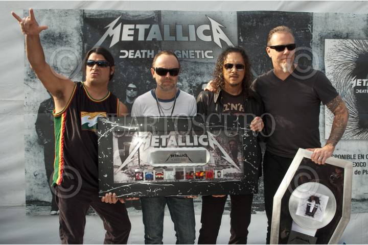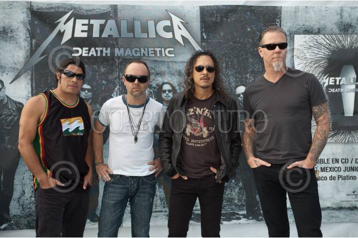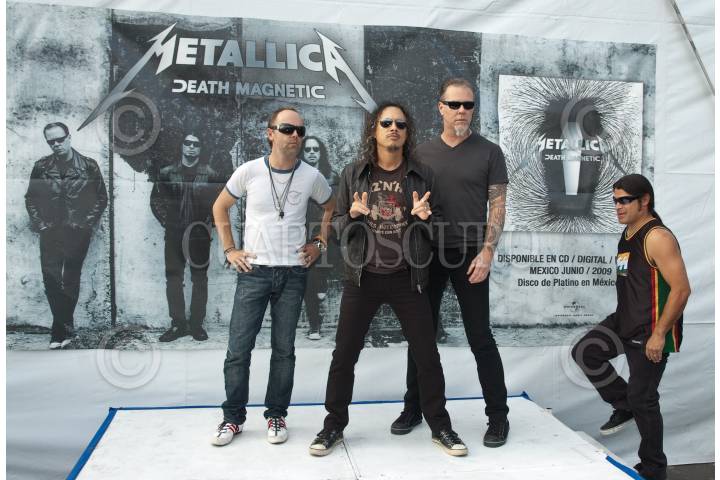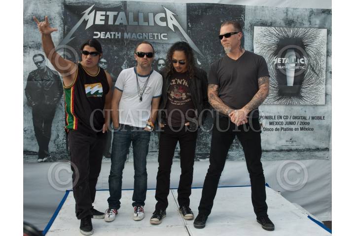 MÉXICO, D.F., 04JUNIO2009.- Roberto Trujillo, Lars Ulrich, Kirk Hammett, James Hetfield, integrantes del grupo de thrash metal Metallica posan previo a una conferencia de prensa previo a su primer concierto que darán en el Foro Sol como parte de su gira Death Magnetic World Tour 2009. FOTO: RODOLFO ANGULO/CUARTOSCURO.COM