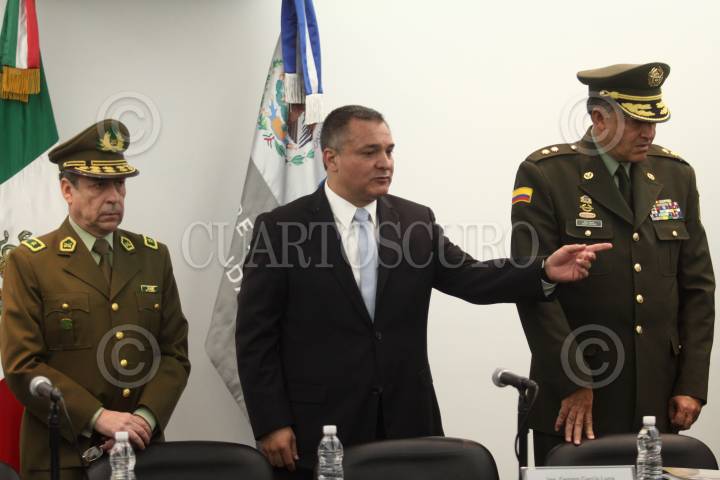 MÉXICO, D.F.,08OCTUBRE2010.- Genaro Garcia Luna, secretario de Seguridad Pública acompañado de Eduardo Gordon Valcárcel, general director de Carabineros de Chile y de Oscar Naranjo Trujillo, director general Policia Nacional de Colombia y secretario ejecutivo de Ameripol ofrecieron una conferencia de prensa sobre la tercera reunión anual de las policías de América (Ameripol) que se desarrollará en las instalaciones de la Secretaría de Seguridad Pública federal. FOTO: RODOLFO ANGULO/CUARTOSCURO.COM