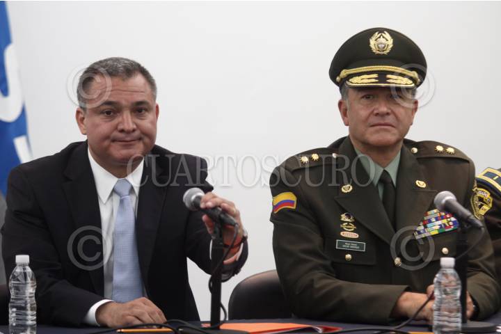 MÉXICO, D.F.,08OCTUBRE2010.- Genaro Garcia Luna, secretario de Seguridad Pública acompañado de Oscar Naranjo Trujillo, director general Policia Nacional de Colombia y secretario ejecutivo de Ameripol ofrecieron una conferencia de prensa sobre la tercera reunión anual de las policías de América (Ameripol) que se desarrollará en las instalaciones de la Secretaría de Seguridad Pública federal. FOTO: RODOLFO ANGULO/CUARTOSCURO.COM