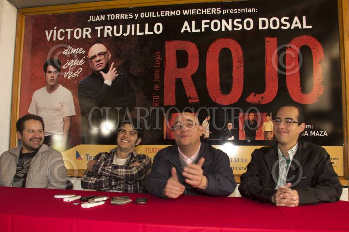 MÉXICO D.F., 12ENERO2012.- Juan Torres, Alfonso Dosal, Victor Trujillo y Guillermo Wiechers durante la conferencia de prensa para anunciar las 100 representaciones de la obra teatral "Rojo" que se presenta en el teatro Rafael Solana del Centro Cultural Veracruzano. FOTO: SAÚL LÓPEZ/CUARTOSCURO.COM