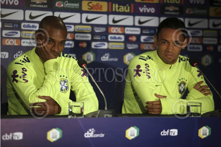 SANTIAGO, CHILE., 06OCTUBRE2015.- La selección brasileña se preparó en el estadio San Carlos de Apoquindo previo a su encuentro de clasificación para Rusia 2018, que sostendrá contra la selección nacional de Chile el próximo jueves. El cuerpo técnico y jugadores sostuvieron un encuentro con la Cruz Roja chilena y con los damnificados del pasado terremoto y tsunami que dañó la Región de Coquimbo. La verdeamarela y sus estrellas ofrecieron sus camisetas en apoyo a la población afectada. En la imagen los jugadores Fernando Luis y Fabihno. FOTO: FÉLIX MÁRQUEZ /CUARTOSCURO.COM