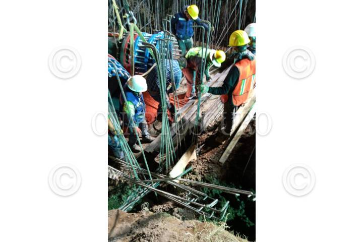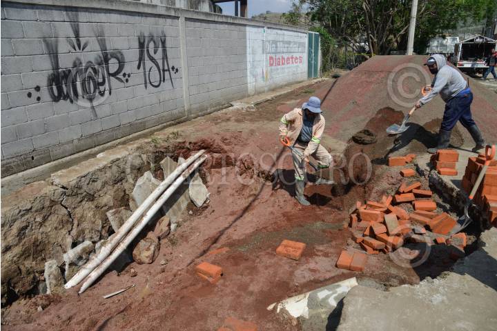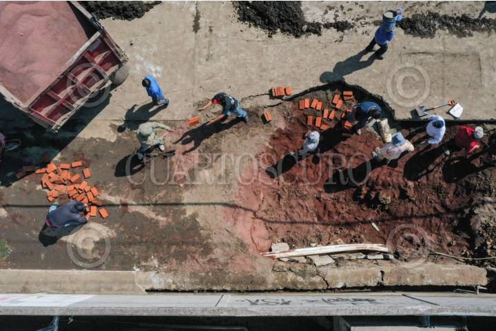 El socavón que permanece sobre la calle Herradura de la colonia Geovillas Jesús María es nuevamente rellenado por trabajadores de la entidad luego de que las recientes lluvias provocaran nuevamente su colapso.