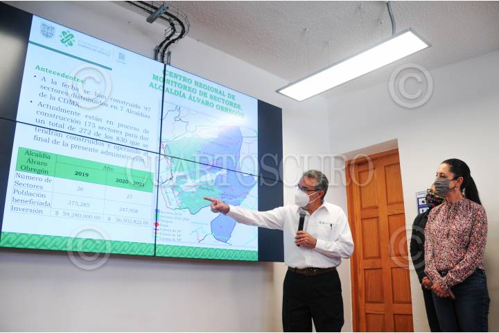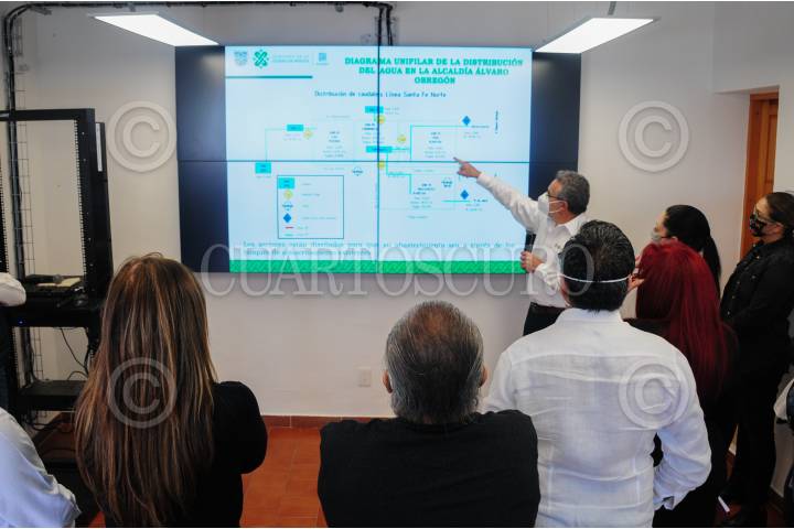 El director del Sistema de Aguas, Rafael Carmona, expone el funcionamiento del nuevo Centro de Telemetría a la jefa de gobierno.