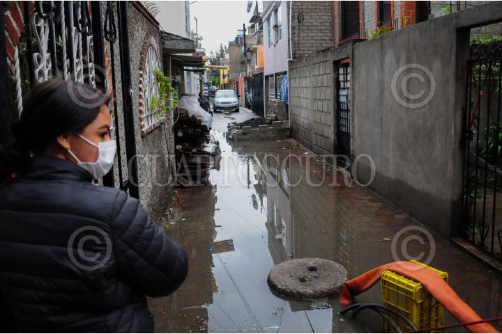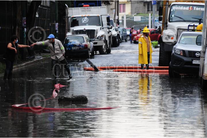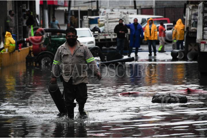 Con ayuda de una máquina, elementos de protección civil y sacmex retiran el agua de los pasillos de las unidades.
